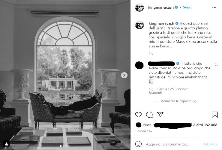 Questa la sua testuale dichiarazione: “A quasi due anni dall’uscita Persona è quinto platino, grazie a tutti quelli che lo hanno reso così speciale, vi voglio bene. Grazie al mio produttore Marz, siamo ancora sulla stessa barca…”.