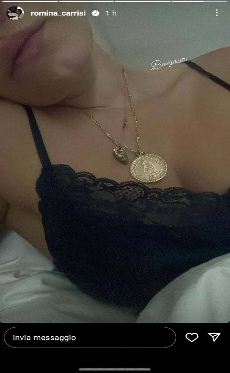 In una Storia caricata sul suo- a dir poco- seguitissimo Profilo Ufficiale Instagram, da lei sapientemente e ben gestito, la ragazza ha pubblicato una foto dove non le si vede il volto per intero, ma solo una parte di esso con le sue belle labbra in primo piano e chiuse. I capelli, scuri e lunghi, non le cadono sulle spalle, dunque si intuisce che li abbia elegantemente raccolti. Al collo una catenella d’oro con ciondolo e indosso un babydoll nero di seta con inserti in pizzo, dotato di spallini sottili. E’ ancora a letto, sdraiata sul materasso e un lenzuolo bianco la copre fino a sotto il seno. Sensuale e iper femminile ha incantato il vasto popolo del Web.